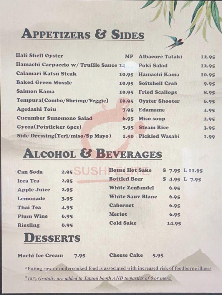 For those seeking warmth, the Nabemono section offers hearty favorites like Beef Sukiyaki and Shabu-Shabu. The Donburi selections, such as Chicken Karaage and Una Jyu, are equally enticing.